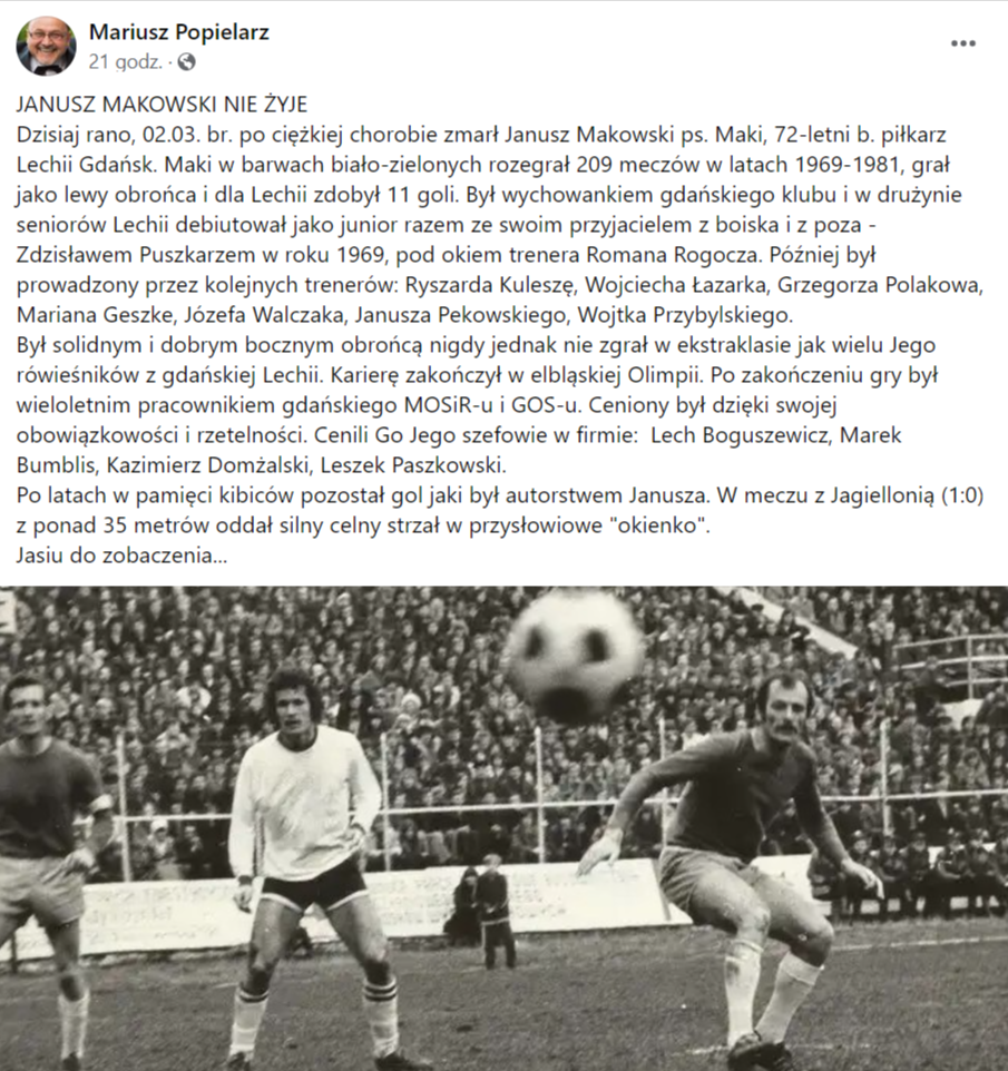 W czwartek 2 marca 2023 zmarł były piłkarz Lechii Gdańsk Janusz Makowski.